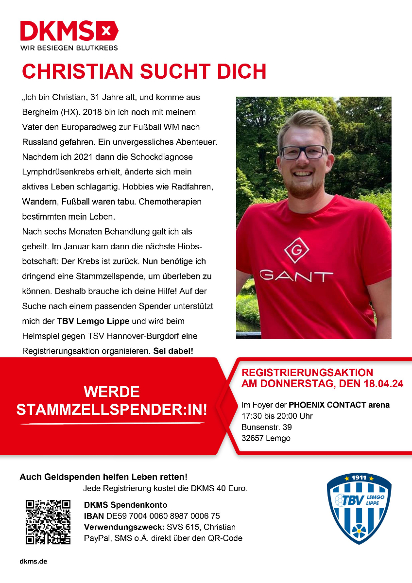 Christians Familie, die DKMS und der TBV bitten alle gesunden Menschen, die zwischen 17 und 55 Jahren alt und noch nicht als möglicher Stammzellspender registriert sind, ganz herzlich darum, beim Heimspiel gegen Hannover zwischen 17:30 Uhr bis 20 Uhr im Foyer der Phoenix Contact-Arena vorbeizukommen, das Mobiltelefon mitzubringen und sich registrieren zu lassen – einfach und schnell.