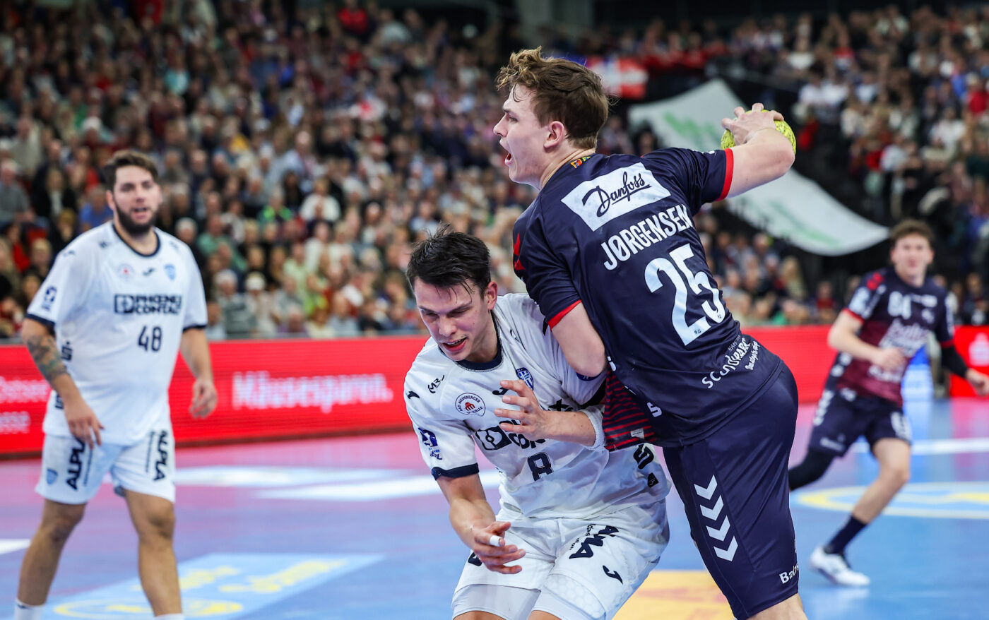 Anpfiff: Noch enger zusammenrücken und alles in die Waagschale werfen, lautete also das Motto in der mit 6.300 Fans ausverkauften GP Joule Arena. Und das gelang dem TBV zu Beginn der Begegnung beeindruckend. Houtepen, der erstmals nach seiner Verletzung von Beginn an startete, sowie Versteijnen, der an seine alte Wirkungsstätte zurückkehrte, verpassten der SG zum Start eine kalte Dusche (3:0, 4.). Erst nach fünf Minuten gelang es den Gastgebern erstmals Möstl im Tor zu überwinden (3:1, 5.). Als nach neun Minuten immer noch eine 7:3-Führung der Gäste auf der Ergebnistafel angezeigt wurde, rieben sich wohl einige SG-Fans bereits verwundert die Augen. Doch in der Folge tauten die Flensburger, trotz eisiger Temperaturen im Norden, langsam auf und stellten die TBV-Abwehr zunehmend vor Probleme. Nach einem Fehlpass im Sieben-gegen-Sechs-Spiel verkürzte Emil Jakobsen nach zwölf Minuten zum 8:7-Anschluss ins leere Lemgoer Tor. Durch einen Strahl von SG-Rückraum-Ass Lasse Möller, dessen Vertragsverlängerung bis 2028 kurz vor dem Spiel verkündet wurde, ging die SG schließlich erstmals in Führung (11:12, 21.). Im Angriff spielte der TBV weiter geduldig und auf den Punkt. Schagen verkürzte nach 25 Minuten auf 13:14. Doch der zusammengewürfelte TBV-Innenblock fand nun zu selten Lösungen gegen das temporeiche Flensburger Spiel. Daran änderte zunächst auch der Torwartwechsel von Möstl zu Urh Kastelic nur wenig. Ärgerlich: Kurz vor der Pause präsentierten sich die Hausherren eiskalt und schraubten das Ergebnis trotz ausgeglichenem Spielverlaufs auf 14:17 in die Höhe.