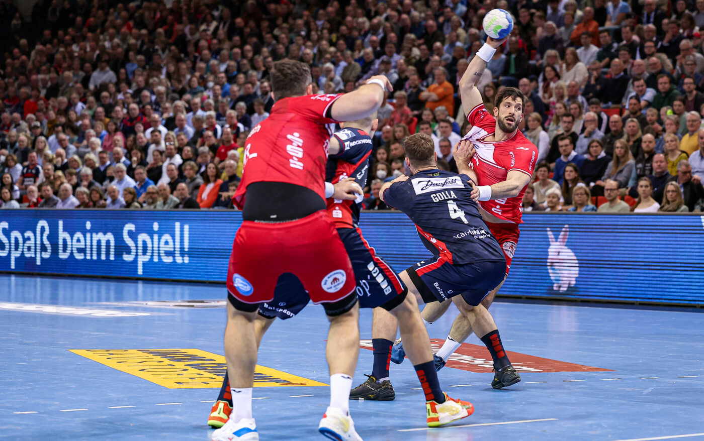 Fokussiert starteten die Lemgoer in die Begegnung und zeigten sich in der Anfangsphase auf Augenhöhe mit der favorisierten Heimmannschaft. Schnell gingen die Lipper durch einen Treffer von Tim Suton in Führung, hinten parierte Kastelic stark gegen den frei am Kreis auftauchenden Kapitän der deutschen Nationalmannschaft, Johannes Golla. Erst nach vier Minuten war es Hans Aaron Mensing, der mit seinem ersten, aus Lemgoer Sicht jedoch leider nicht letzten Treffer, für den 1:1-Ausgleich sorgte. Es entwickelte sich ein Spiel auf Augenhöhe, bei dem beide Teams gute Torgelegenheiten ungenutzt ließen. Der TBV lief somit immer einem knappen Rückstand hinterher, hielt das Spiel jedoch lange offen. Nach 22 Minuten war es Schagen, der auf 10:12 verkürzte. Doch in der Folge unterliefen den Lippern einfache technische Fehler, die das Team von SG-Trainer Maik Machulla eiskalt ausnutzte und bis zur 26. Minute auf 15:10 davonzog. Grund genug für Kehrmann die erste Auszeit des Abends zu nehmen und seine Spieler noch einmal wachzurütteln. Mit der Halbzeitsirene erhöhten die Flensburger durch Golla auf 17:13.