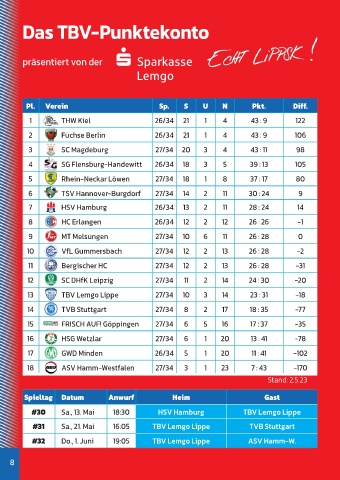 #30 Sa., 13. Mai 18:30 HSV Hamburg TBV Lemgo Lippe