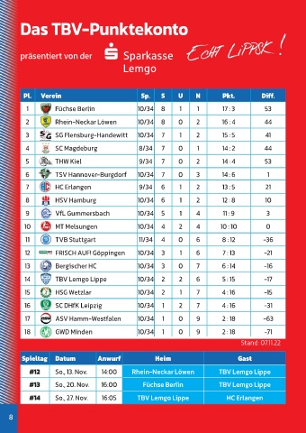 #12 So., 13. Nov. 14:00 Rhein-Neckar Löwen TBV Lemgo Lippe