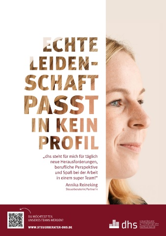 „dhs steht für mich für täglich neue Herausforderungen, berufliche Perspektive und Spaß bei der Arbeit in einem super Team!“ Annika Reineking Steuerberaterin/Partnerin DU MÖCHTEST TEIL UNSERES TEAMS WERDEN? WWW.STEUERBERATER-DHS.DE