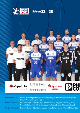 Hintere Reihe v.l.: Bennet Risch (Physiotherapeut), Christian Soyka (Mannschaftszahnarzt), Isaías Guardiola, Thore Oetjen, Jan Brosch, Emil Buhl Lærke, Niels Versteijnen, Matthias Struck (Co-Trainer),