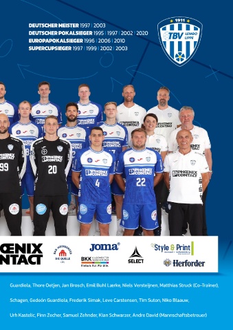 Hintere Reihe v.l.: Bennet Risch (Physiotherapeut), Christian Soyka (Mannschaftszahnarzt), Isaías Guardiola, Thore Oetjen, Jan Brosch, Emil Buhl Lærke, Niels Versteijnen, Matthias Struck (Co-Trainer),