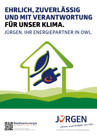 EHRLICH, ZUVERLÄSSIG UND MIT VERANTWORTUNG FÜR UNSER KLIMA. JÜRGEN. IHR ENERGIEPARTNER IN OWL. Ein Unternehmen der Stadtwerke Bad Salzuflen, Detmold, Lemgo, Rinteln, Vlotho . Tel. 0800 607 1111 oder unter www.stadtwerkenergie.de